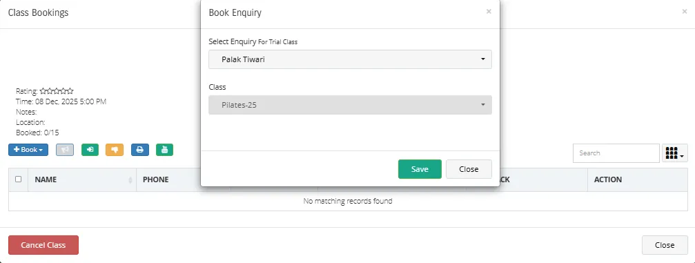 ✔ The enquiry will now be added to the class booking list without converting the person into a member account.